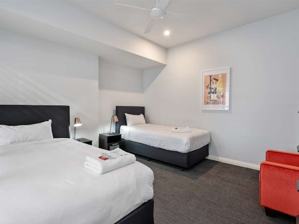 Featuring two bedrooms, and a separate living area. Fitted with a kitchenette, with a convenient dishwasher, microwave, and stove top. Enjoy the latest in-room technology with brand new smart TVs for seamless streaming and personalised entertainment during your stay. Offering an abundance of natural light, and opening windows make it perfect to unwind and relax in a multi-functional living and dining space.