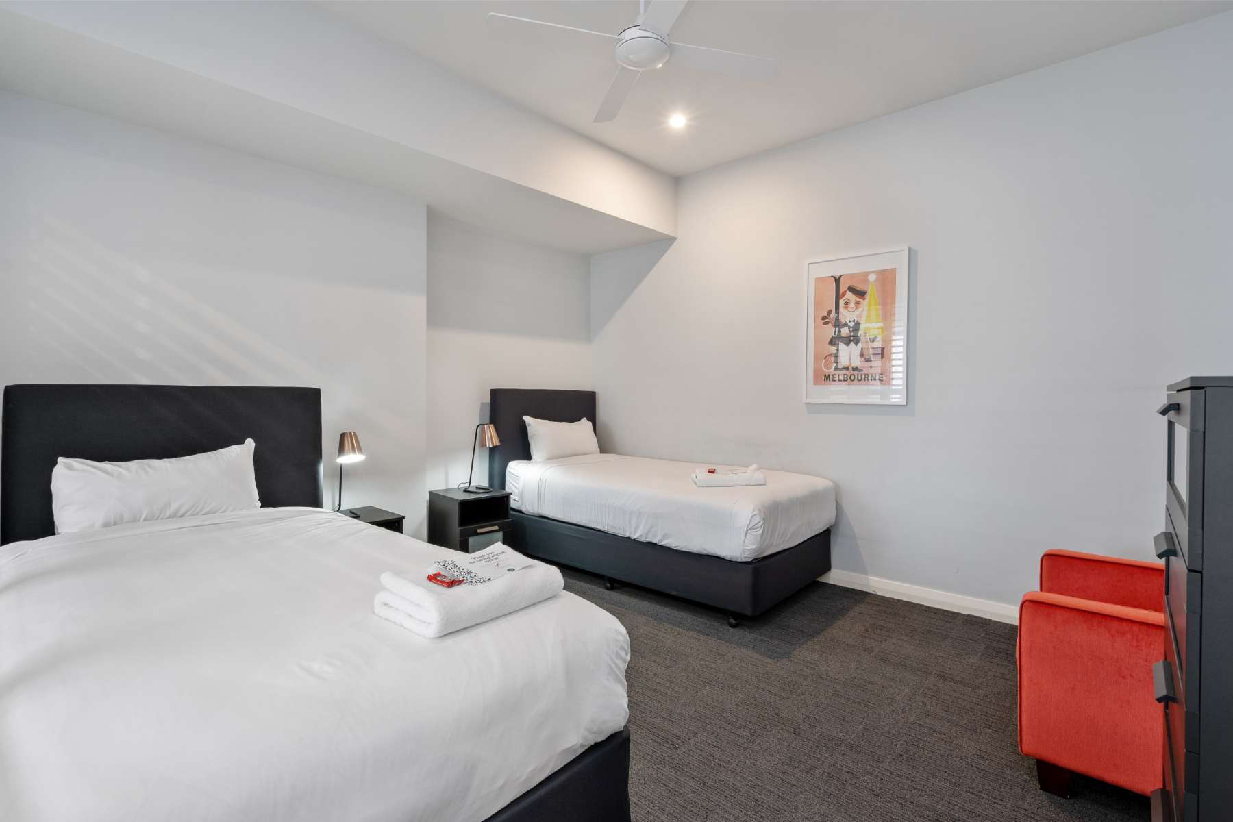 A beautifully appointed apartment with 2 bedrooms perfect for sharing or families, featuring a luxurious King-sized bed in the main room and two King Single beds in the other bedroom.