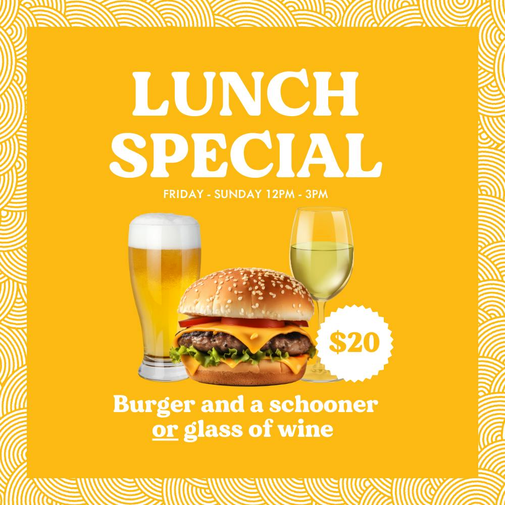 Get your hands on one of our delicious burgers and a schooner or glass of house wine for only $20!